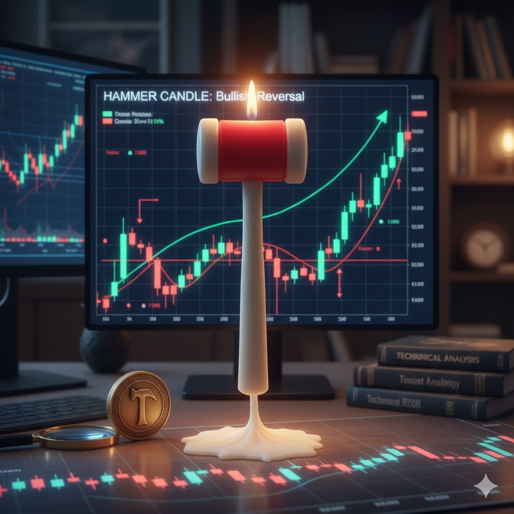 Der Hammer ist ein bullisches Umkehrsignal – klein im Körper, lange Lunte/langer unterer Schatten.