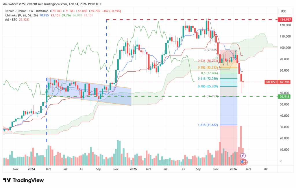 Die klassische charttechnische Projektion aus der Flaggenstange führte exakt in den Bereich um 125.000 USD – ein lehrbuchmäßiges Setup der technischen Analyse.