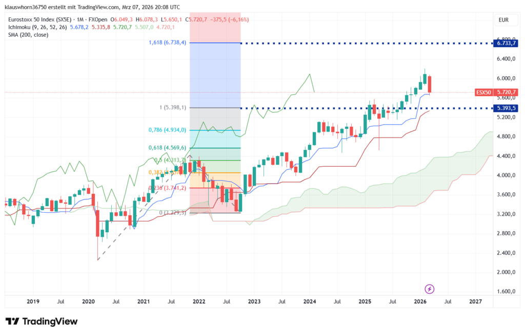 Seit dem Corona-Tief im März 2020 sowie der Korrekturphase im Jahr 2022 hat der Index seine wichtigsten Ziele aus der Fibonacci-Extension sukzessive abgearbeitet. Im Jahr 2025 erreichte der EuroStoxx50 das erste zentrale Kursziel der Extension im Bereich von 5.400 Punkten. Dort folgte zunächst eine Konsolidierung, bevor der Markt seinen Aufwärtstrend weiter fortsetzte.